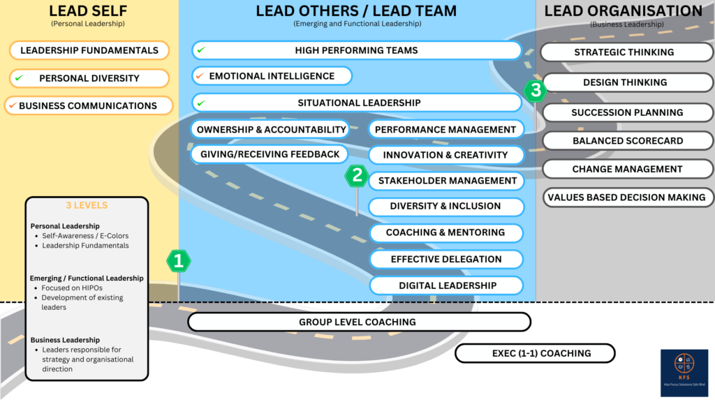 Our approach is modular, allowing for a structured yet flexible journey across three distinct stages of growth: Personal, Emerging/Functional, and Business Leadership. This roadmap guides leaders through a progressive curriculum that scales alongside their professional responsibilities.